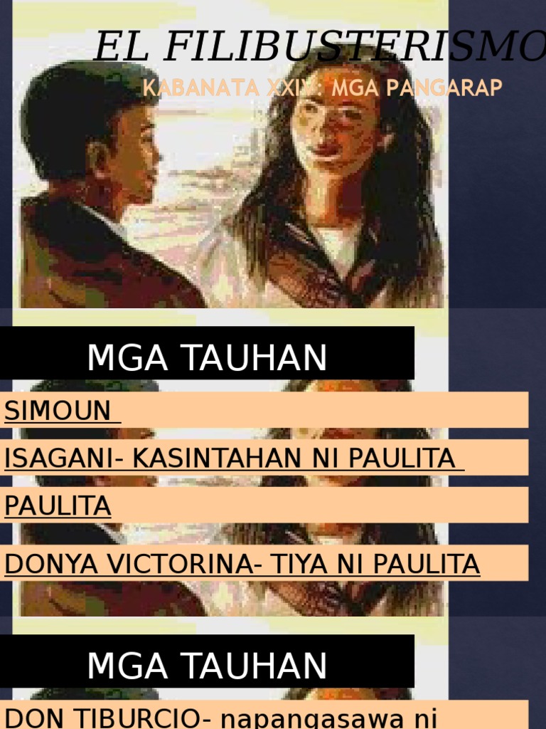 29012012 KABANATA 24 - MGA PANGARAP Ang kabanata 24 ay isa sa mga mapagbunyag na kabanata ng El Filibusterismo. Kabanata XXIV Mga Pangarap. Katulad ng kabanata nina Crisostomo Ibarra at Maria Clara at Elias at Salome sa Noli Me Tangere ito ay kabanata rin ng dalawang magkatipan sina Isagani at Paulita Gomez.